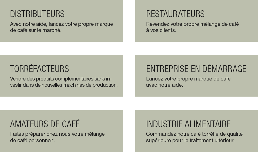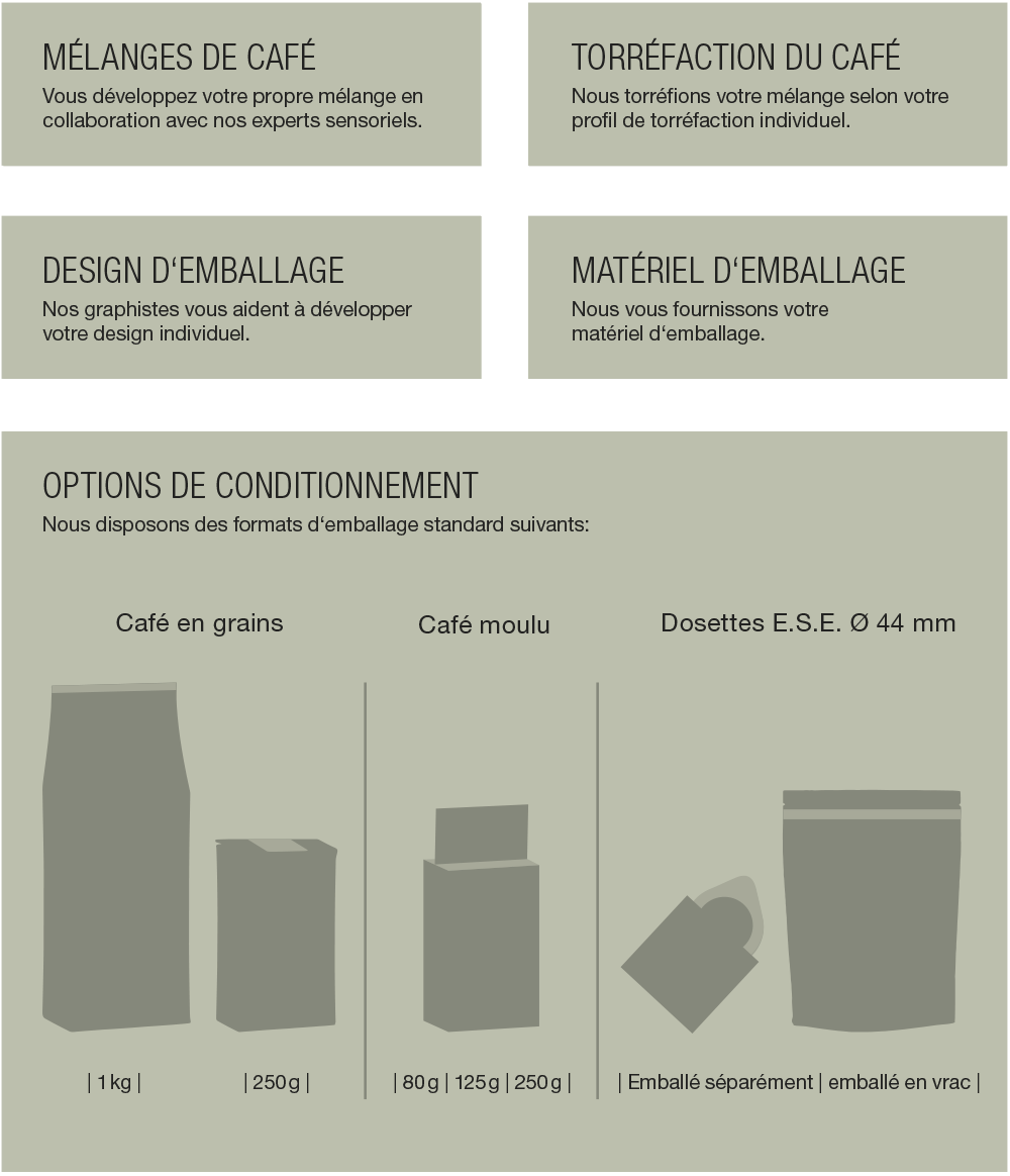 Grâce à notre société sœur Blaser Trading, nous avons un accès direct au marché mondial du café vert et pouvons répondre à tous vos souhaits en matière de café. À Berne, nous avons toujours un grand choix de cafés verts en stock. Nous pouvons les utiliser immédiatement pour vos mélanges individuels. Nos experts en analyse sensorielle vous aident à créer votre propre café. Nous proposons différents films d‘emballage que nous pouvons imprimer avec votre logo dans notre production. Pour les designs d‘emballage plus complexes, nous travaillons avec différents partenaires externes. Nous répondons également volontiers à vos souhaits individuels. N‘hésitez pas à nous contacter.